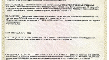 Сертификат соответствия медных витопарных кабелей DATALAN требованиям пожарной безопасности ТР ТС 004 /2011 и ГОСТ 31565-2012