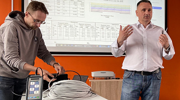 В заключительной части состоялась демонстрация запаса прочности медной линии СКС DATALAN кат. 6А на основе кабеля U/UTP - моделирование ошибок монтажа путем поэтапного физического воздействия на геометрию медной линии СКС DATALAN с параллельными тестами физических характеристик тракта с помощью тестера AEM TestPro CV100 и выводом результатов измерений на экран с комментариями технического эксперта.